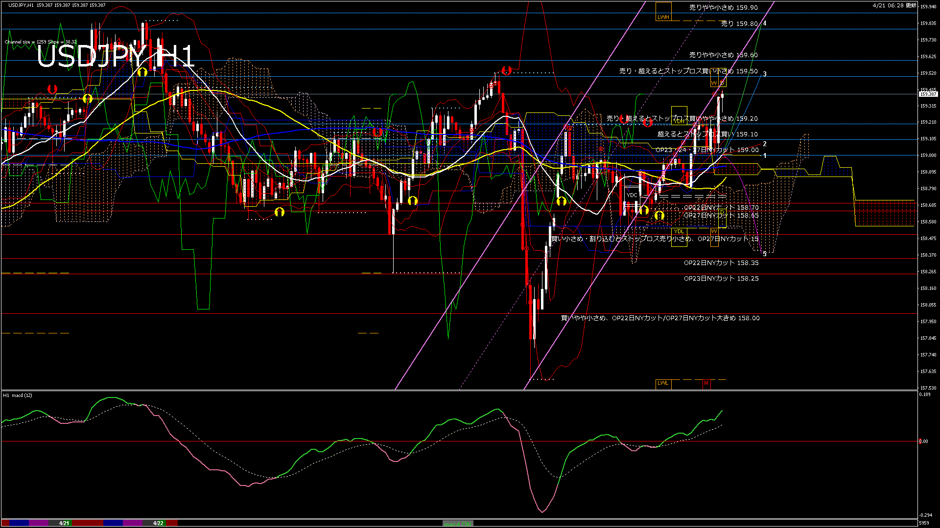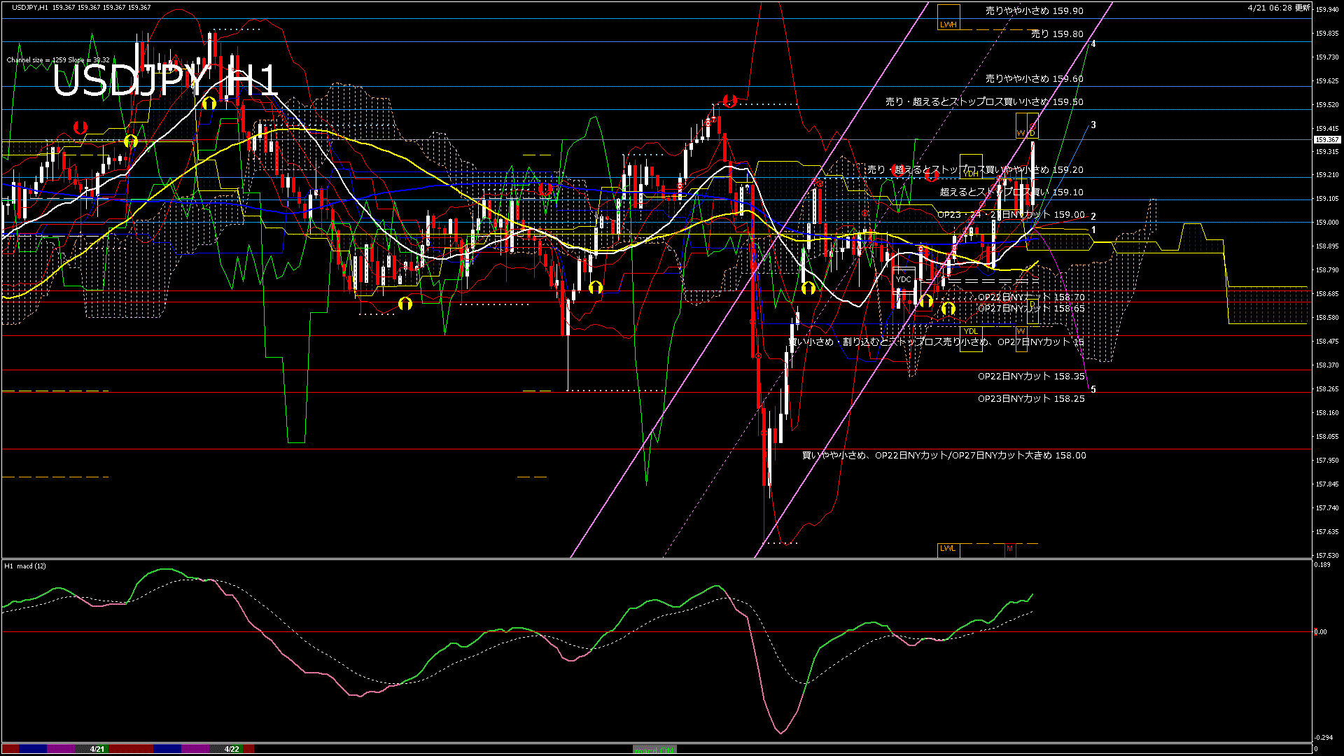 USDJPY-H1移動平均線と現在値(RSI)-2026.4.22 0:00:00