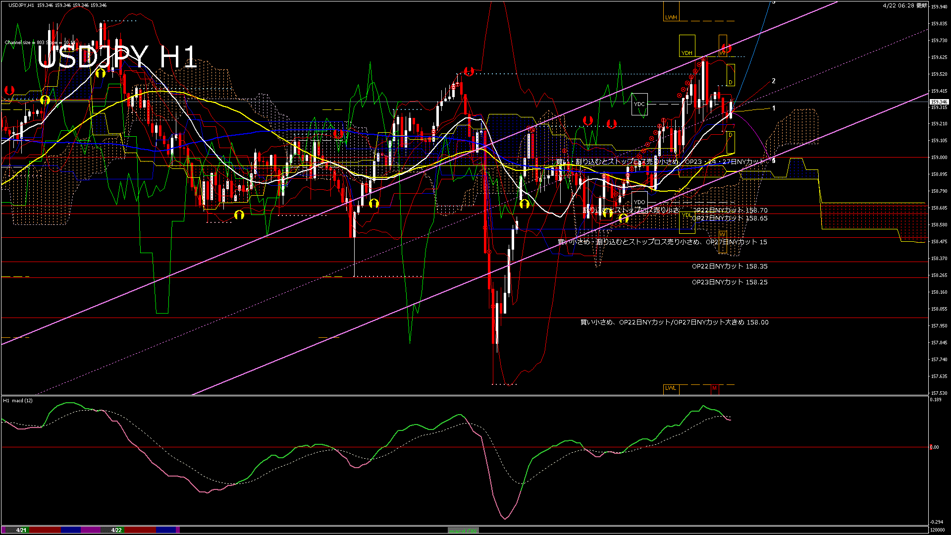 USDJPY-H1移動平均線と現在値(RSI)-2026.4.22 11:00:00