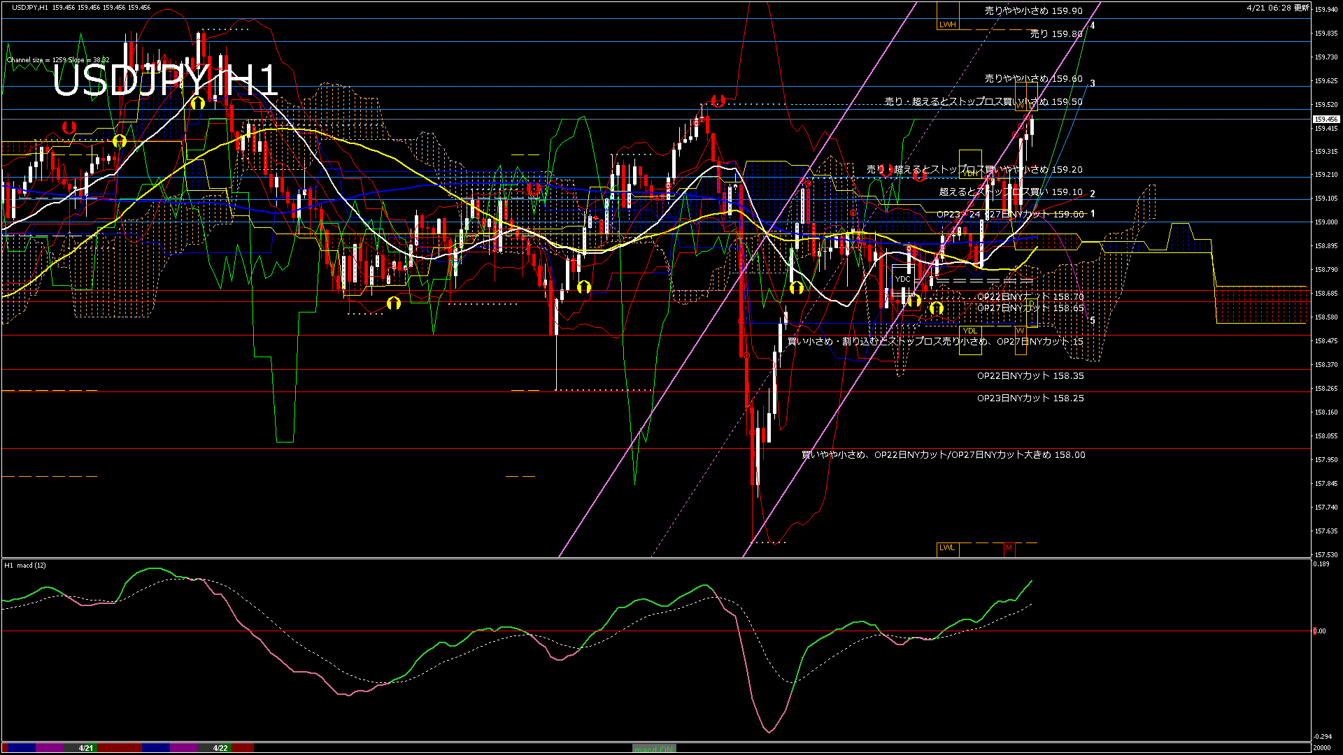 USDJPY-H1移動平均線と現在値(RSI)-2026.4.22 2:00:00