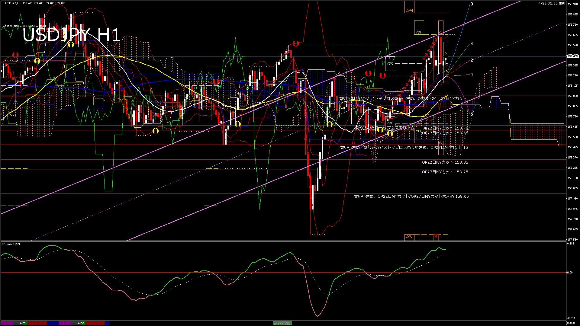 USDJPY-H1移動平均線と現在値(RSI)-2026.4.22 8:00:00