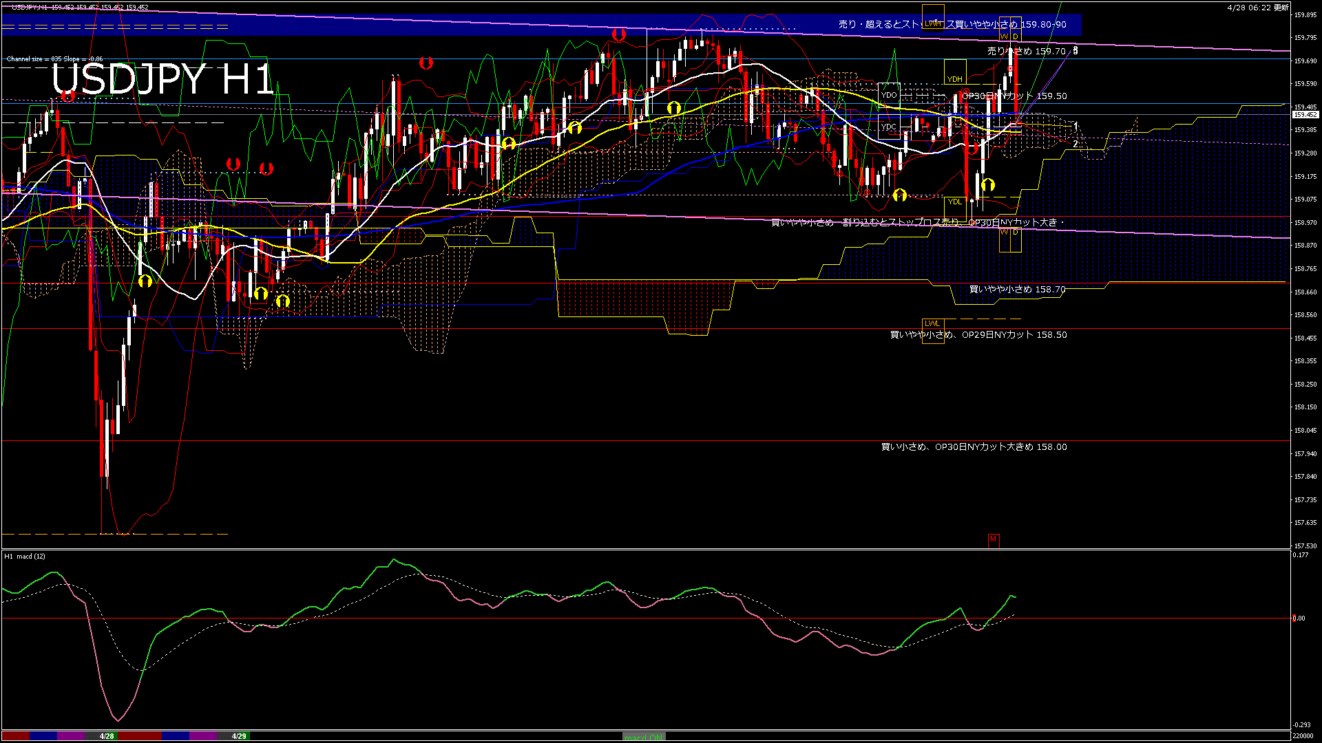 USDJPY-H1移動平均線と現在値(RSI)-2026.4.28 22:00:00