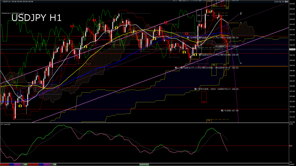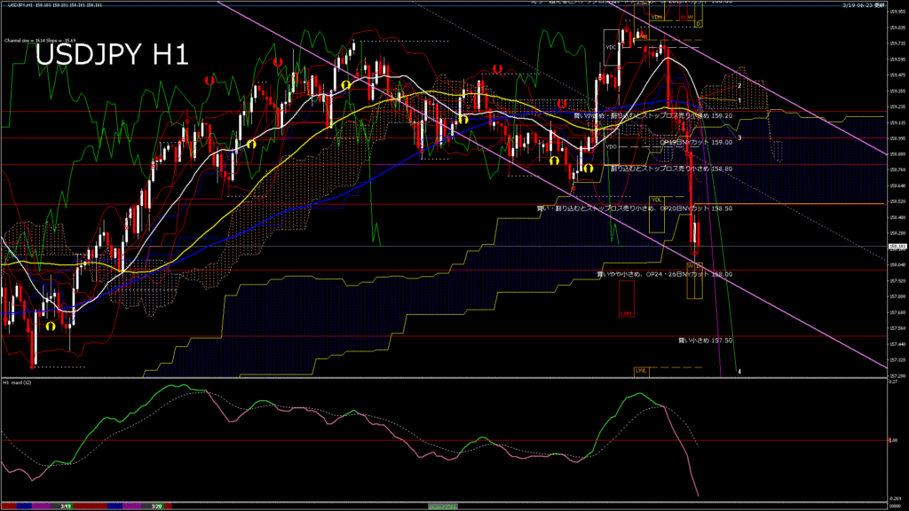 情報 USDJPY-H1移動平均線と現在値(RSI)-2026.3.20 5:00:06