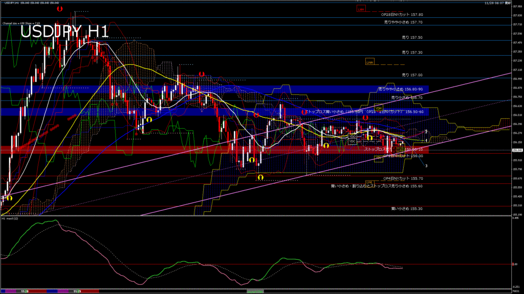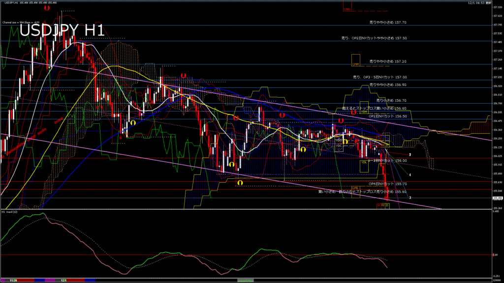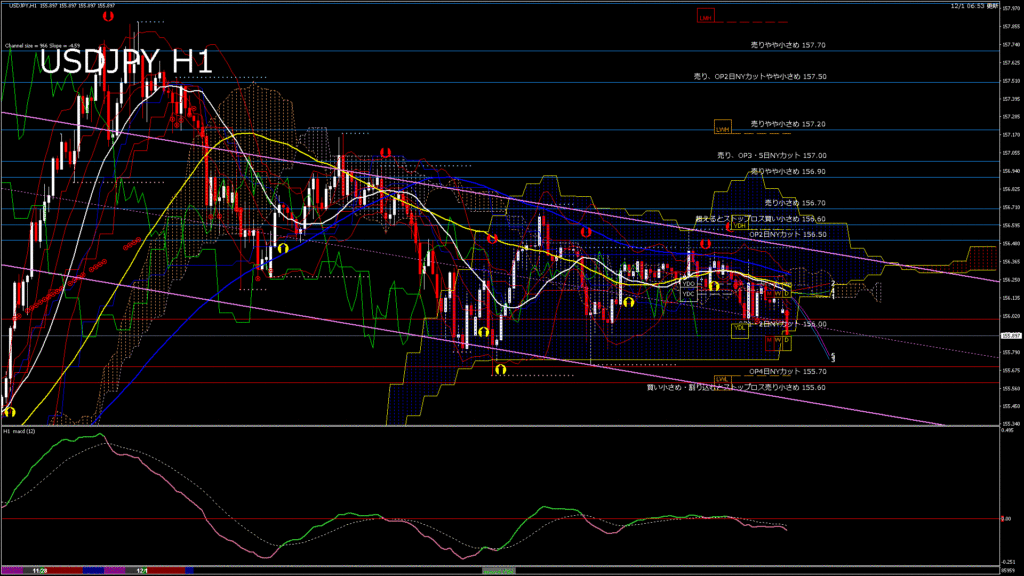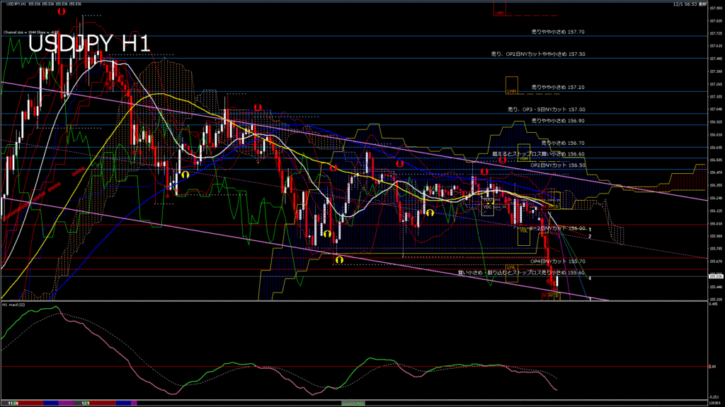 情報 USDJPY-H1移動平均線と現在値(RSI)-2025.12.1 16:00:00