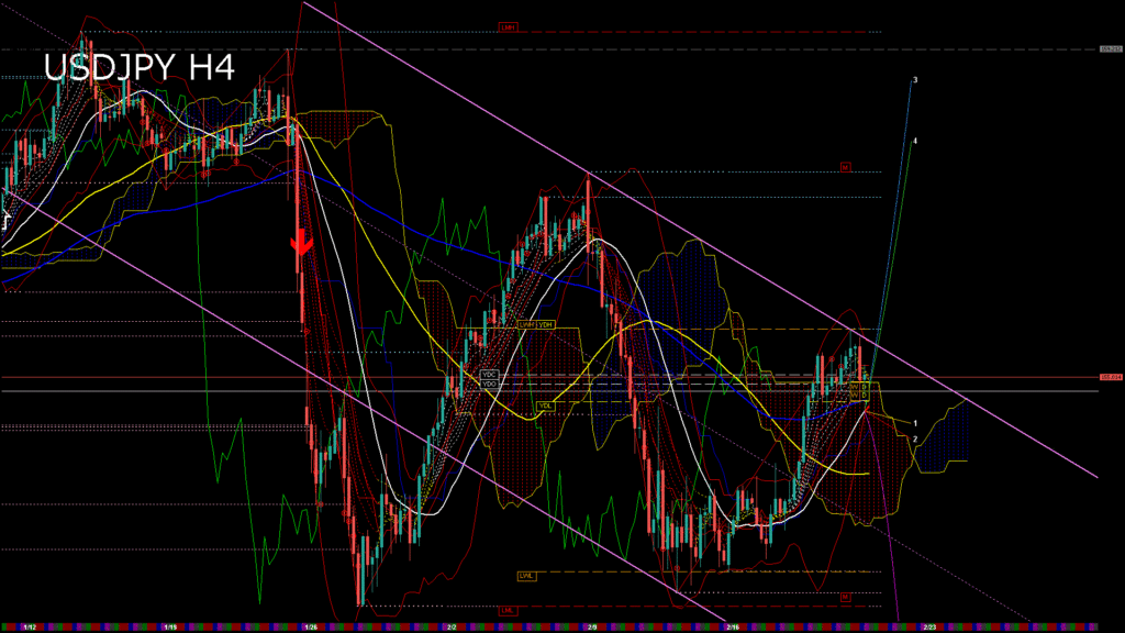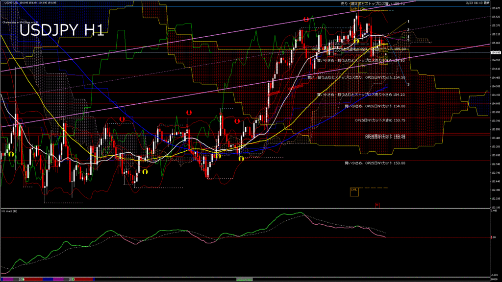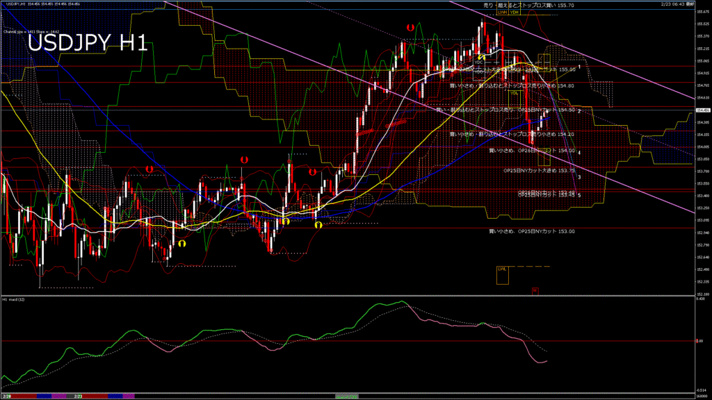 情報 USDJPY-H1移動平均線と現在値(RSI)-2026.2.23 16:00:00