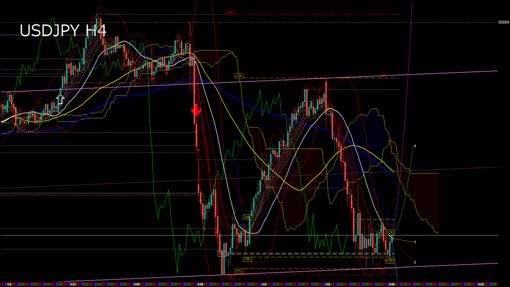 USDJPY-H4移動平均線と現在値(RSI)-2026.2.16 23:00:03