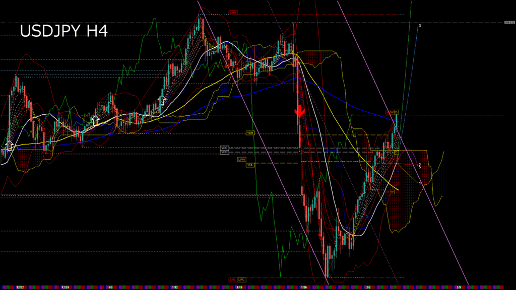 USDJPY-H4移動平均線と現在値(RSI)-2026.2.4 19:00:09