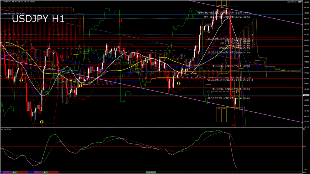 情報 USDJPY-H1移動平均線と現在値(RSI)-2025.8.25 6:00:31