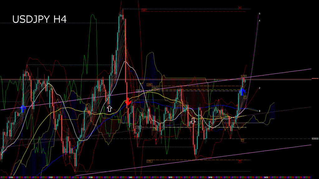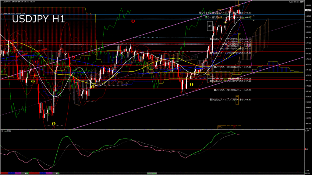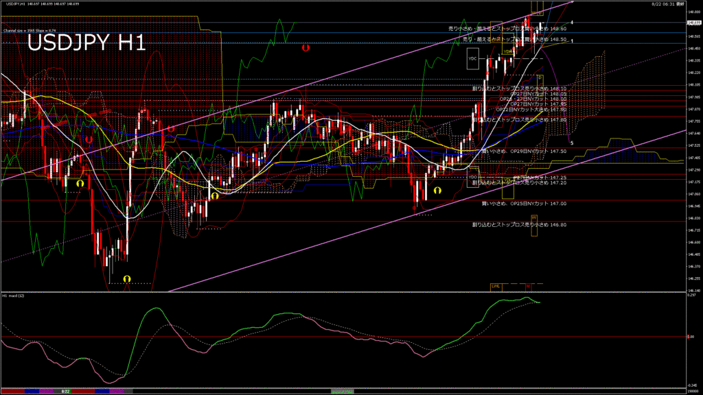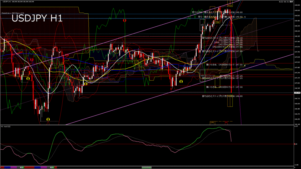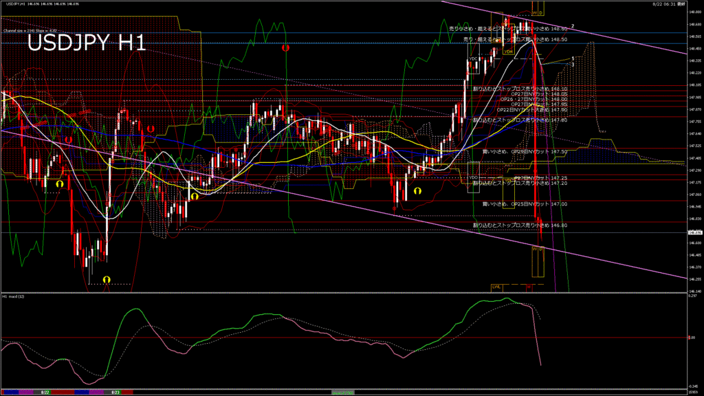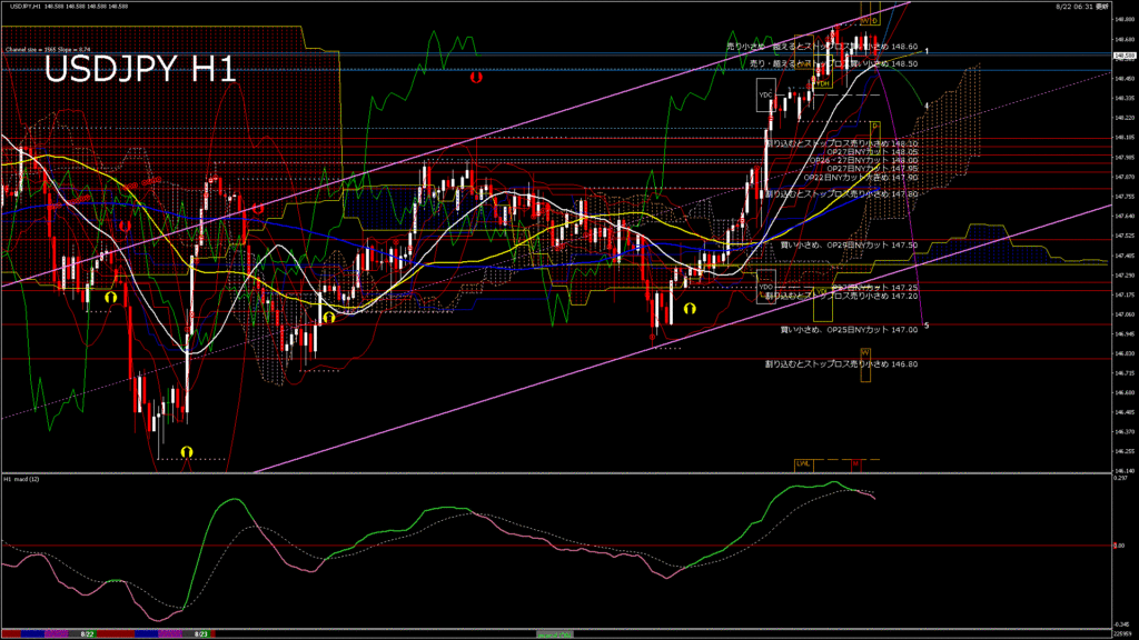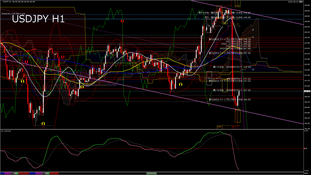 情報 USDJPY-H1移動平均線と現在値(RSI)-2025.8.23 3:00:00