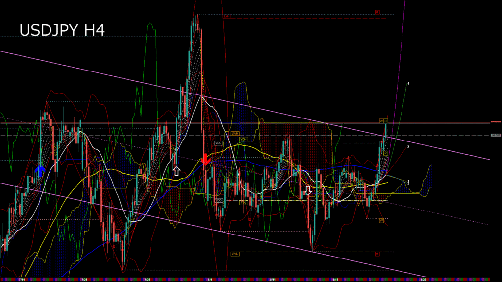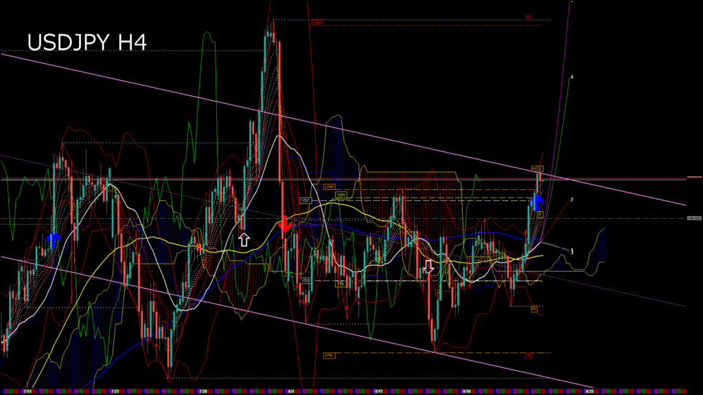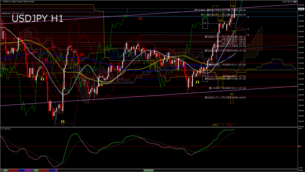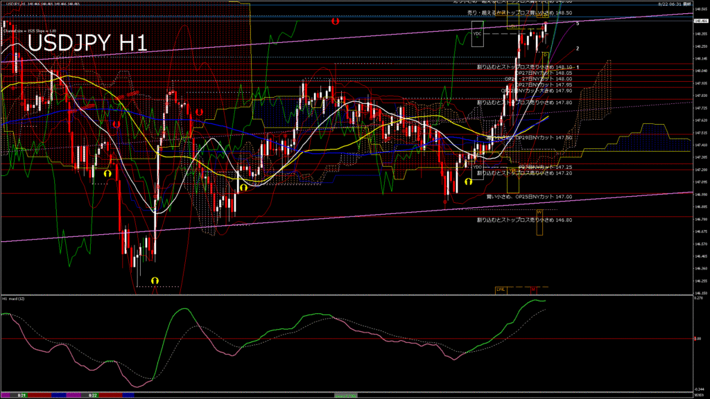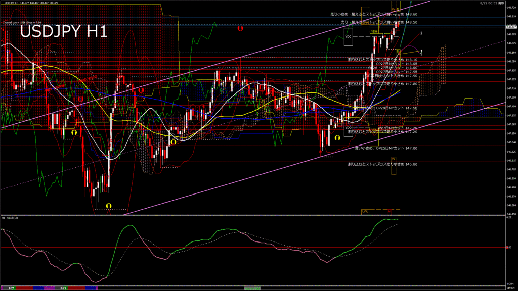 情報 USDJPY-H1移動平均線と現在値(RSI)-2025.8.22 18:00:00