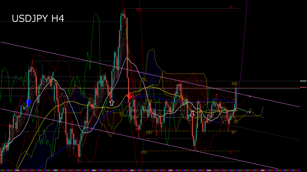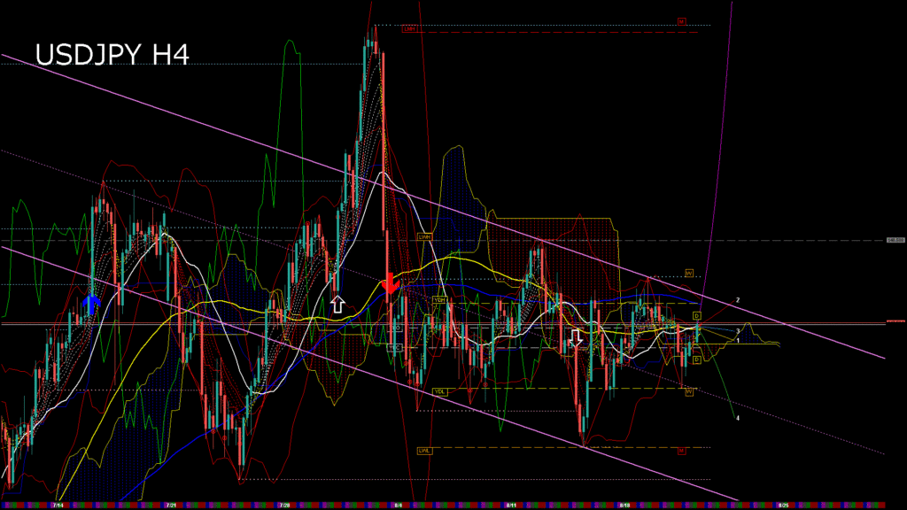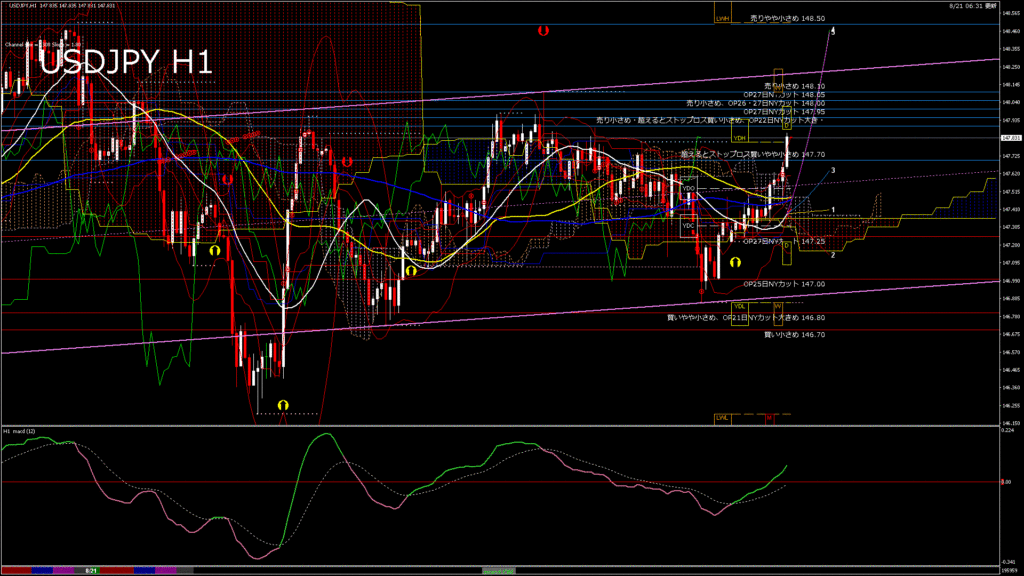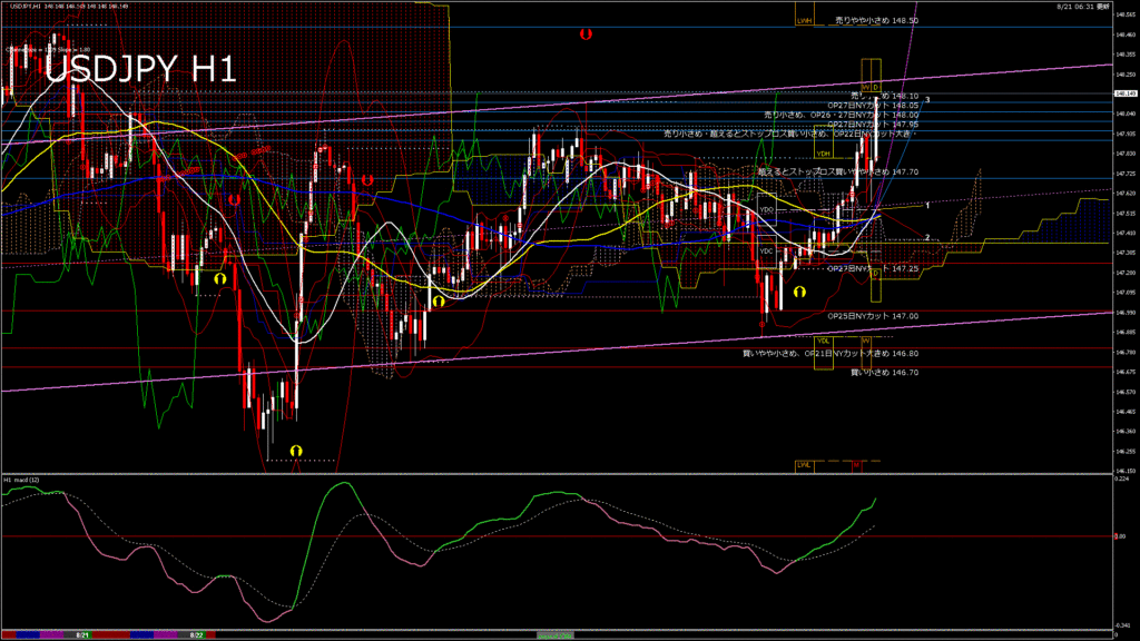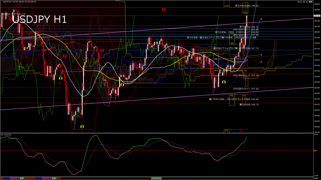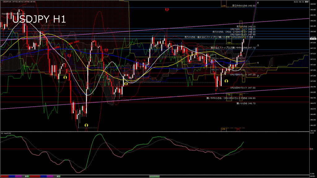 情報 USDJPY-H4移動平均線と現在値(RSI)-2025.8.22 2:00:00