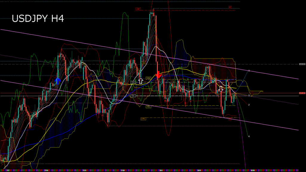 情報 USDJPY-H1移動平均線と現在値(RSI)-2025.8.18 12:00:03