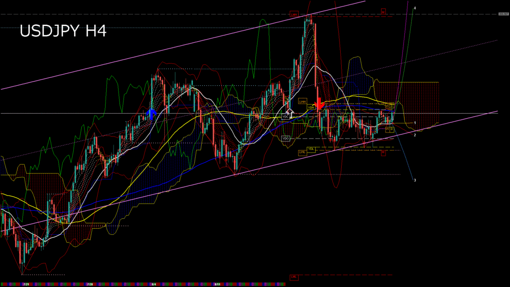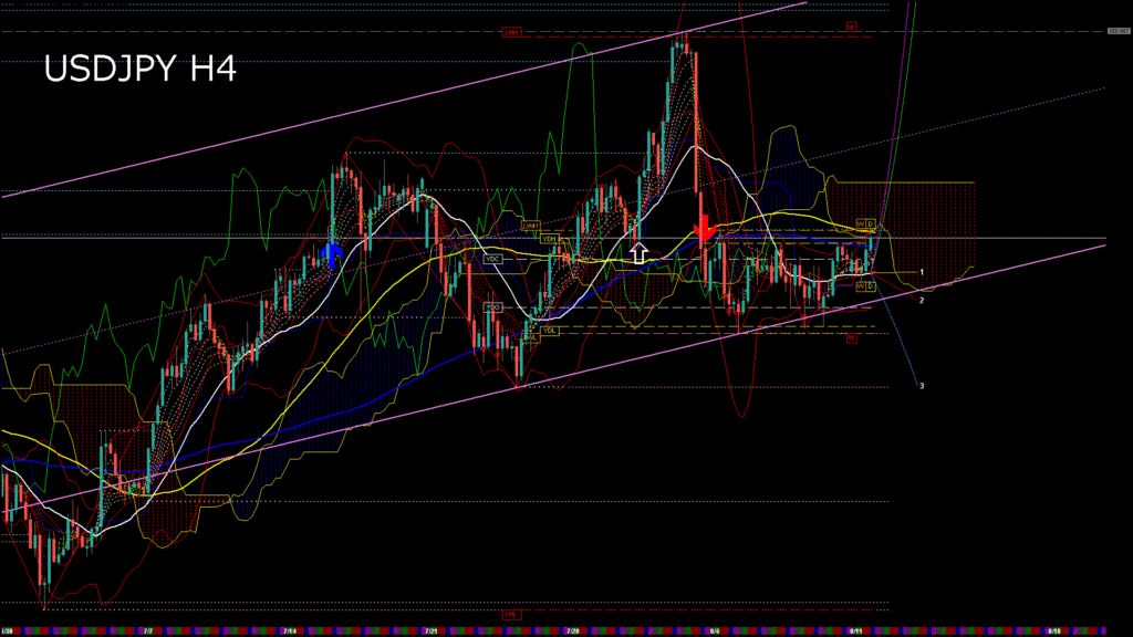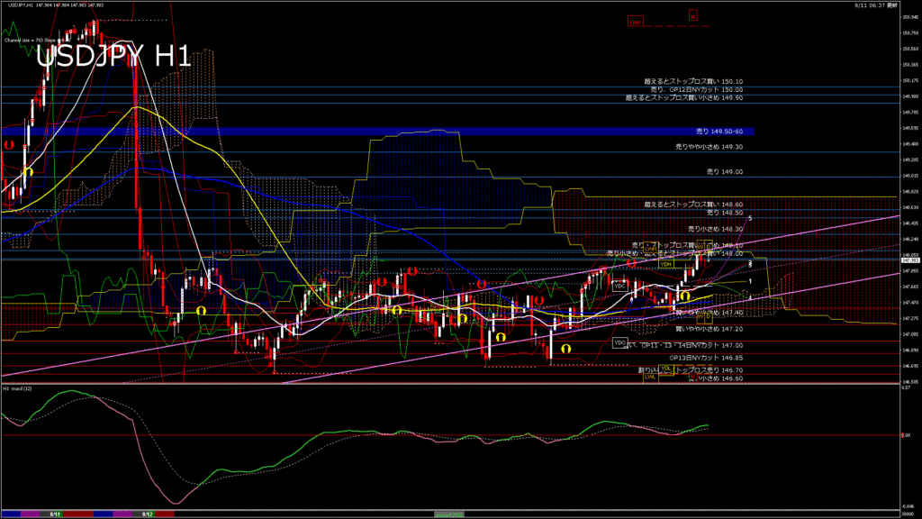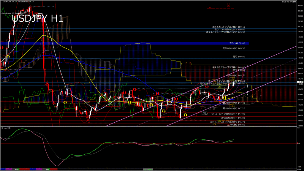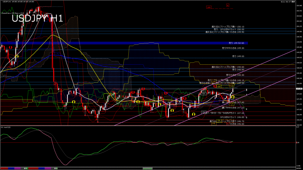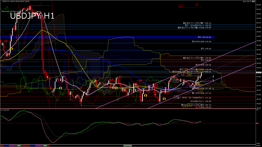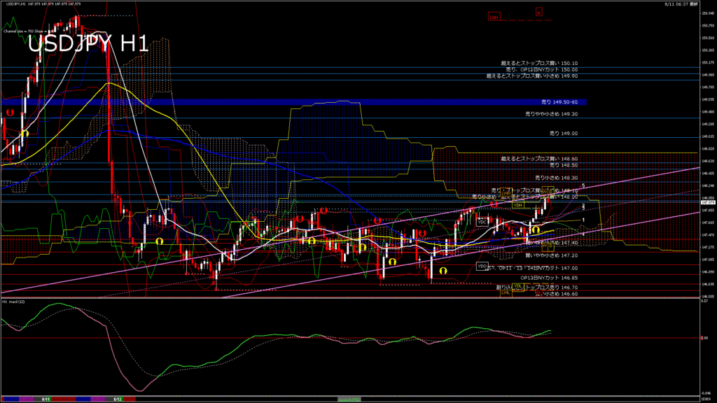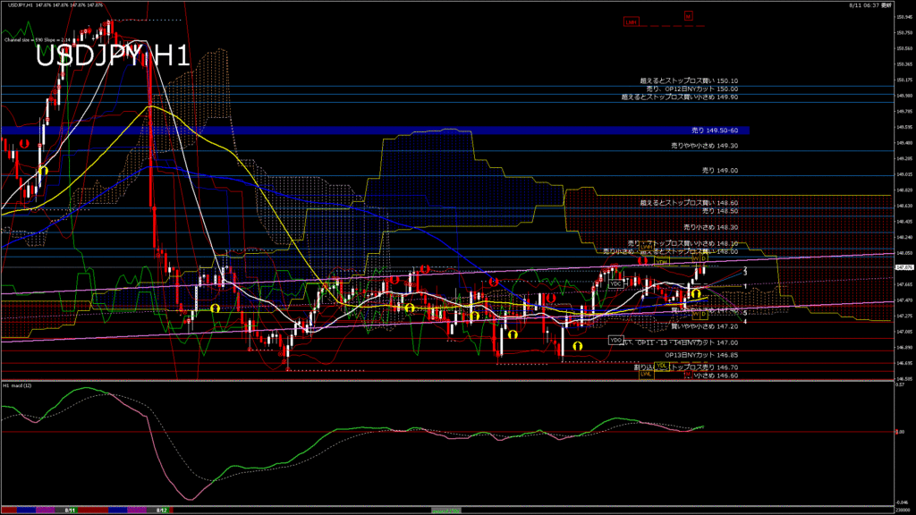 情報 USDJPY-H1移動平均線と現在値(RSI)-2025.8.12 5:00:00