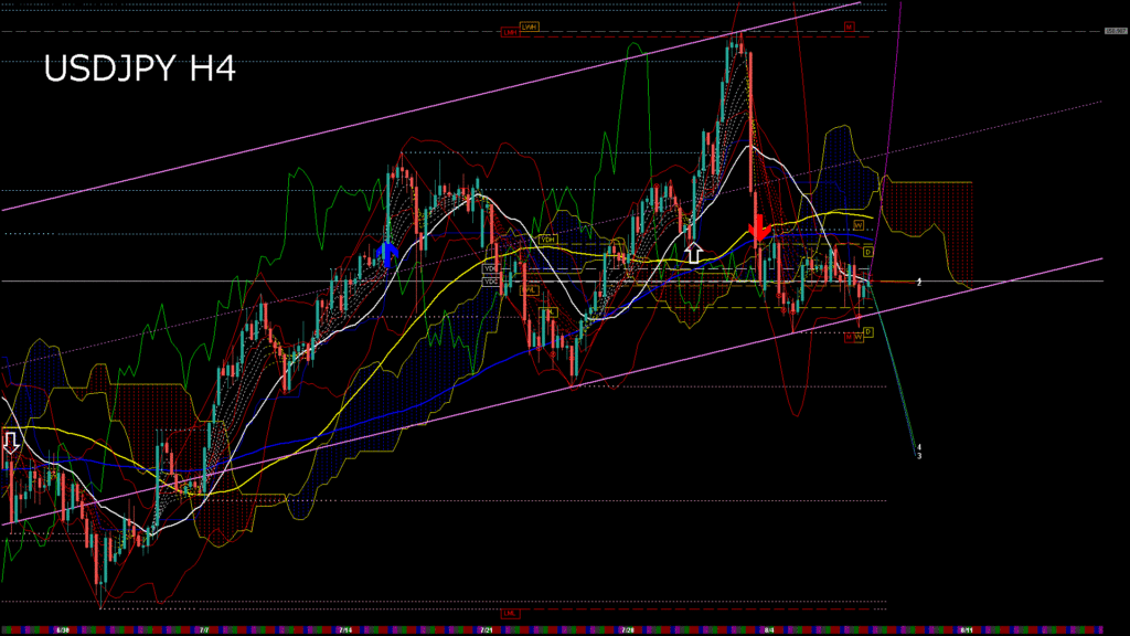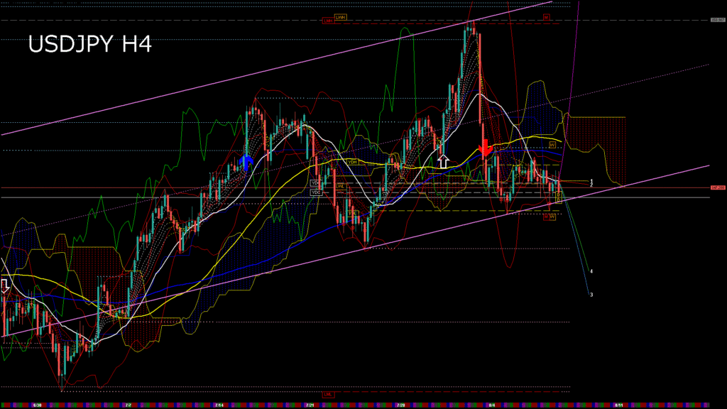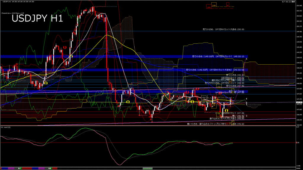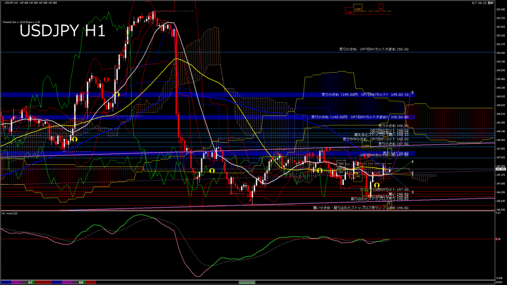 情報 USDJPY-H1移動平均線と現在値(RSI)-2025.8.8 7:00:00