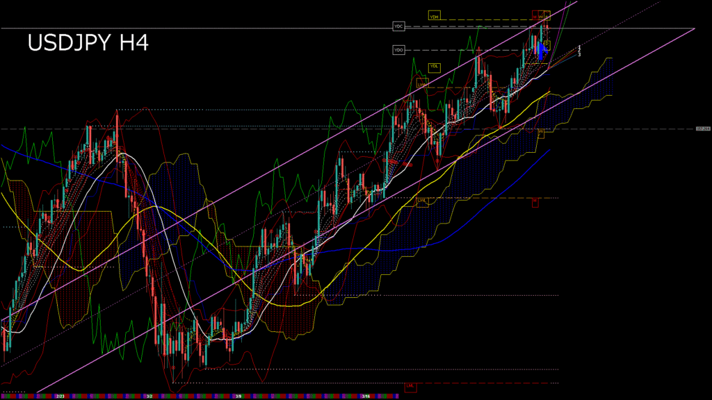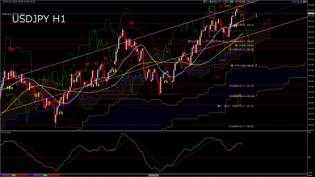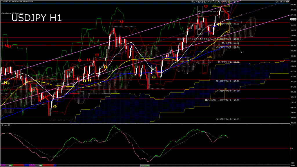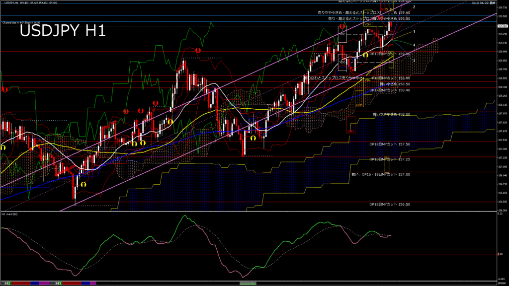 情報 USDJPY-H4移動平均線と現在値(RSI)-2026.3.13 15:00:04