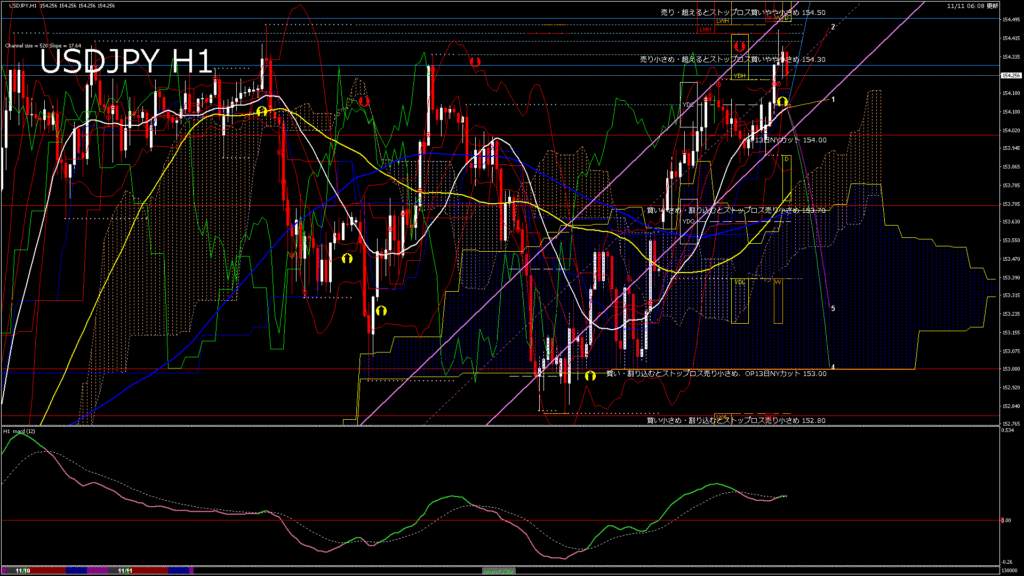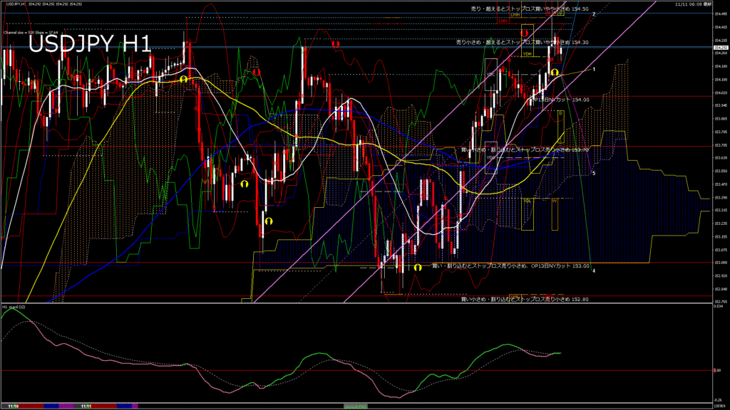 情報 USDJPY-H4移動平均線と現在値(RSI)-2025.11.11 19:00:04